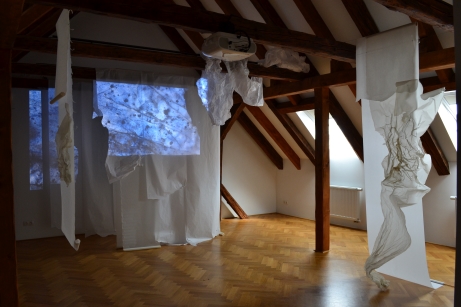 Cyklus tisků vznikl specifickým postupem. Na počátku přede mnou ležely sněhově bílé polystyrenové desky. Postupně začaly tát a mizet pod horkovzdušnou pistolí. Vynořovaly se tvary, některé z hlubin, jiné z výšin, koncentrované chvíle v okamžiku mizení hmoty. Následným prosvicováním odtavených desek vznikly fotografie.